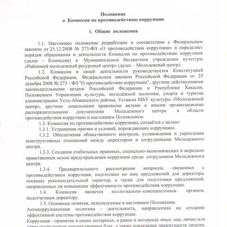 1.2. Комиссия в своей деятельности руководствуется Конституцией Российской Федерации, Федеральным законом Российской Федерации от 25 декабря 2008 № 273 - ФЗ "О противодействии коррупции", другими действующими законодательными актами Российской Федерации и Республики Хакасия, Положением Управлении культуры, молодёжной политики, спорта и туризма администрации Усть-Абаканского района, Уставом МБУ культуры «Молодежный центр», другими локальными правовыми актами и иными организационно распорядительными документами Молодежного центра в области противодействия коррупции и настоящим Положением.